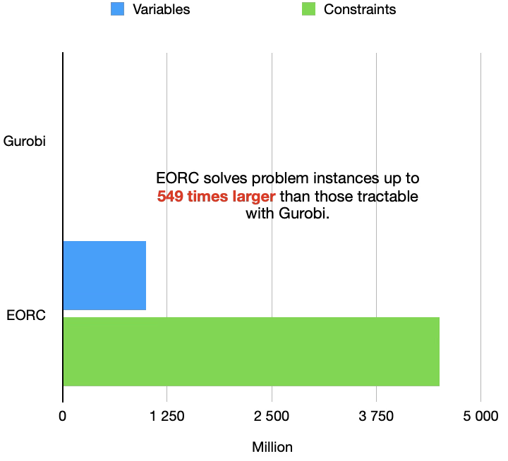 - Proprietary EORC algorithms capable of solving large-scale problems that are intractable for leading commercial solvers